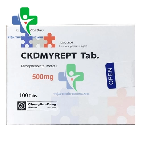 Ckdmyrept tab. 500mg với thành phần chính là Mycophenolat Mofetil 500 mg được dùng trong các trường hợp ghép thận, ghép gan, ghép tim không cùng huyết thống. Ckdmyrept tab. 500mg sản phẩm của Chong Kun Dang Pharmaceutical Corp.