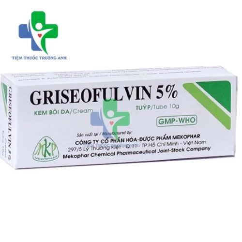 Griseofulvin 5% 10g sản xuất bởi dược phẩm Mekophar, điều trị bệnh nấm ở tóc, da, lông, móng hoặc kẽ tay, chân. Griseofulvin 5% 10g không dùng cho phụ nữ có thai và cho con bú.