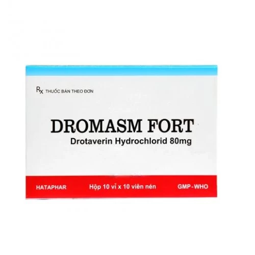 Dromasm fort 80mg Hataphar là một loại thuốc kháng sinh dùng đường uống có dạng viên nén với thành phần chính chứa Drotaverin, có tác dụng chống co thắt cơ trơn. Do đó, được chỉ định phổ biến trong trường hợp: co thắt dạ dày-ruột, cơn đau quặn mật, co thắt đường mật, cơn đau quặn thận và co thắt đường niệu-sinh dục, co thắt tử cung,... Thuốc dùng được cho người lớn và trẻ em trên 12 tuổi, chú ý không dùng cho người suy gan nặng, suy thận nặng, blốc nhĩ thất độ II - III, suy tim nặng và đối tượng mẫn cảm với thành phần sản phẩm.