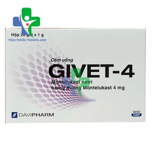 - Sản phẩm Givet 4mg Davipharm - Điều trị hỗ trợ bệnh hen, viêm mũi dị ứng hiện đang có bán tại Tiệm thuốc Trường Anh - Nơi cung cấp sỉ/lẻ các loại thuốc uy tín hiện nay. Để nhận được giá tốt nhất hãy liên hệ với chúng tôi qua hotline: 097.189.9466 hoặc nhắn tin vào zalo sđt: 090.179.6388 để được nhân viên báo giá tốt nhất cho bạn.